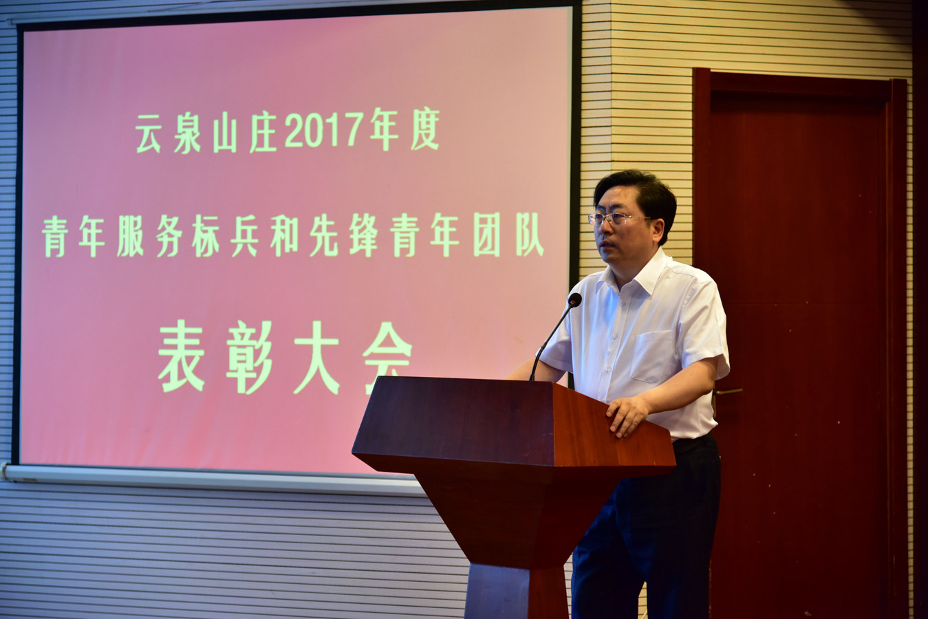 5月27日下午,云泉山莊召開2017年度青年服務(wù)標兵和先鋒青年團隊表彰大會,楊國華副總經(jīng)理宣讀表彰決定,李中亞總經(jīng)理為獲獎員工頒發(fā)證書。